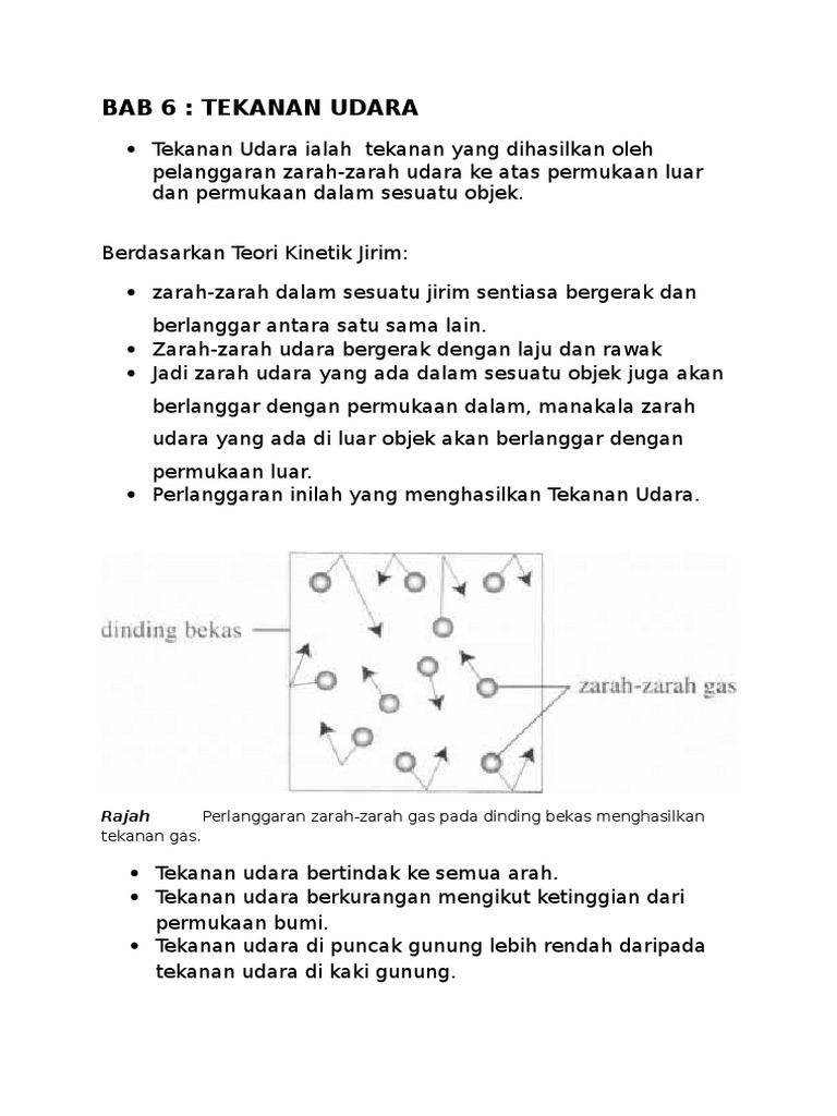 Kewujudan Tekanan Udara Teori kinetik gas kinetic theory of gases menyatakan bahawa molekul gas adalah sentiasa bergerak bebas moving freely dan sentiasa berlanggar colliding terhadap dinding bekasnya container. Full PDF Package Download Full PDF Package. NOTA SAINS TINGKATAN 2---BAB 6.